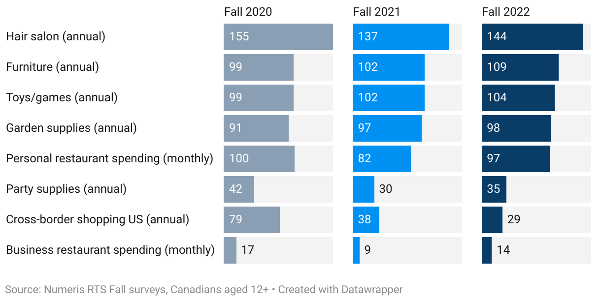 Declining: These categories were affected by the pandemic and have not yet bounced back. This includes sectors like hair salons, cross-border shopping, and apparel, especially children's clothing, which is 17% lower in the Fall 2024 survey compared to Fall 2019.